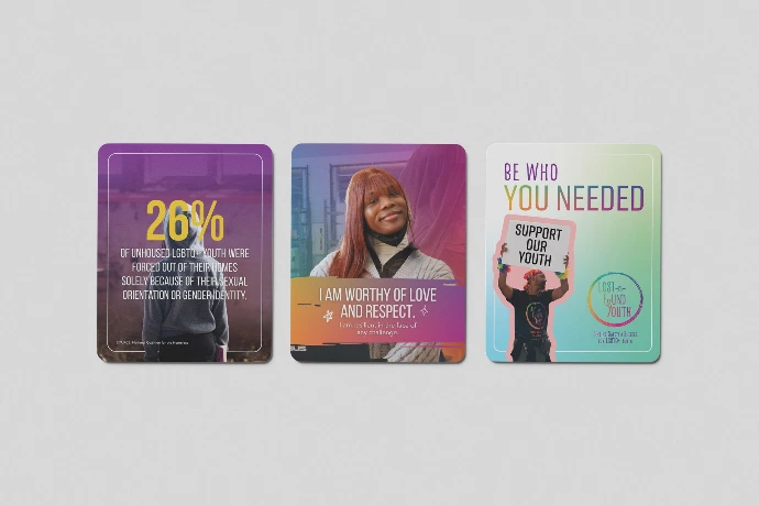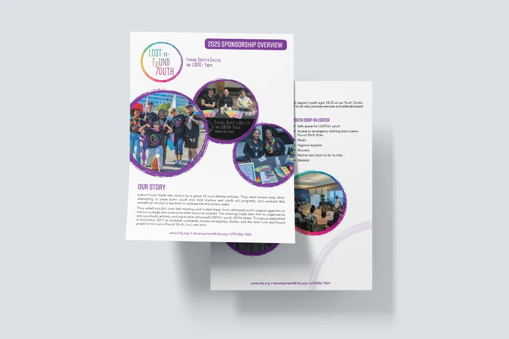 Lost-n-Found Youth serves a vulnerable and diverse population, providing critical support, resources, and advocacy for LGBTQ+ youth experiencing homelessness. The challenge was creating creative materials that could communicate their programs and impact with sensitivity, clarity, and authenticity. With multiple initiatives running simultaneously from outreach campaigns to fundraising and educational efforts, Lost-n-Found needed design that could resonate with both youth and supporters, while maintaining a consistent and approachable visual voice across print, digital, and social channels.